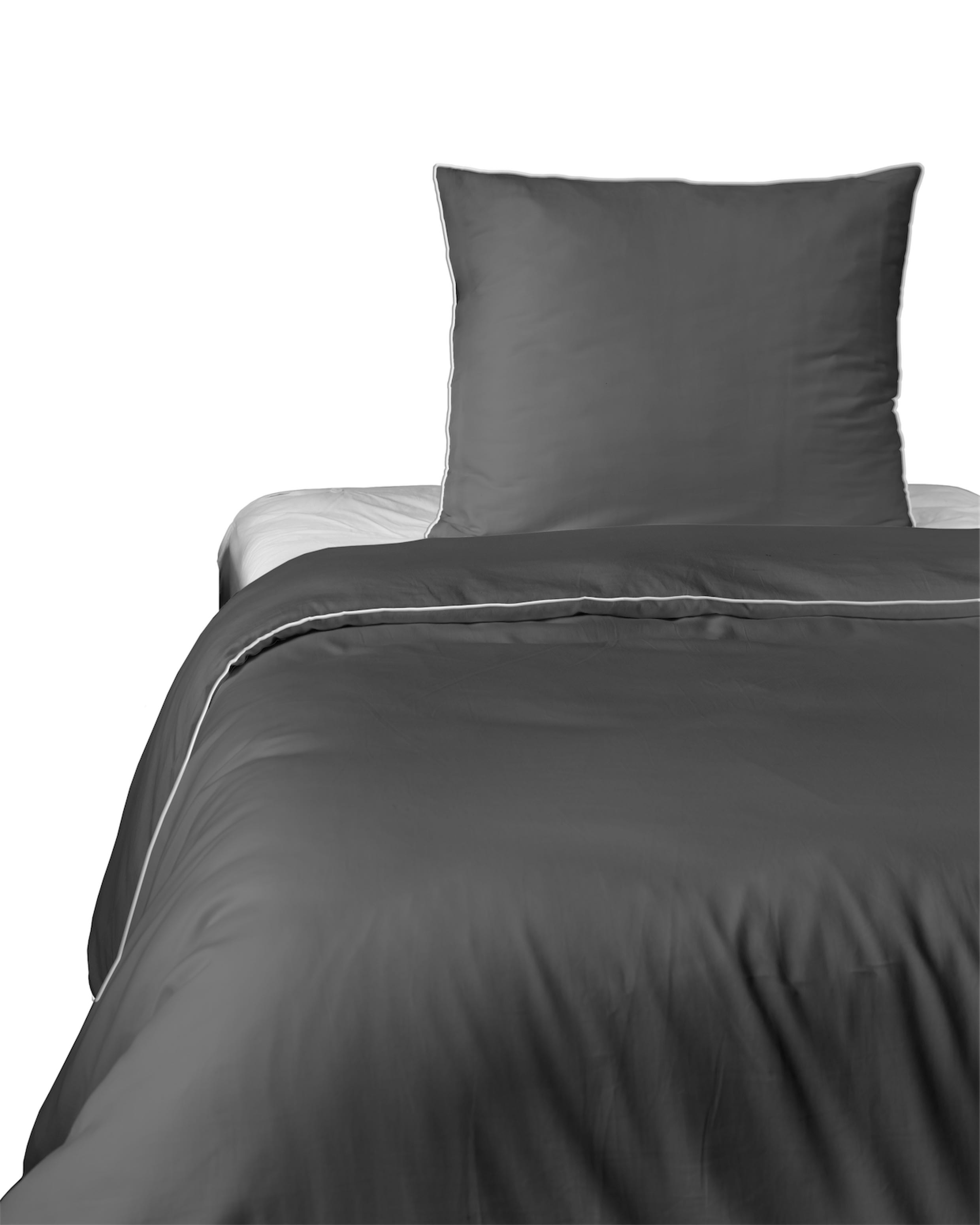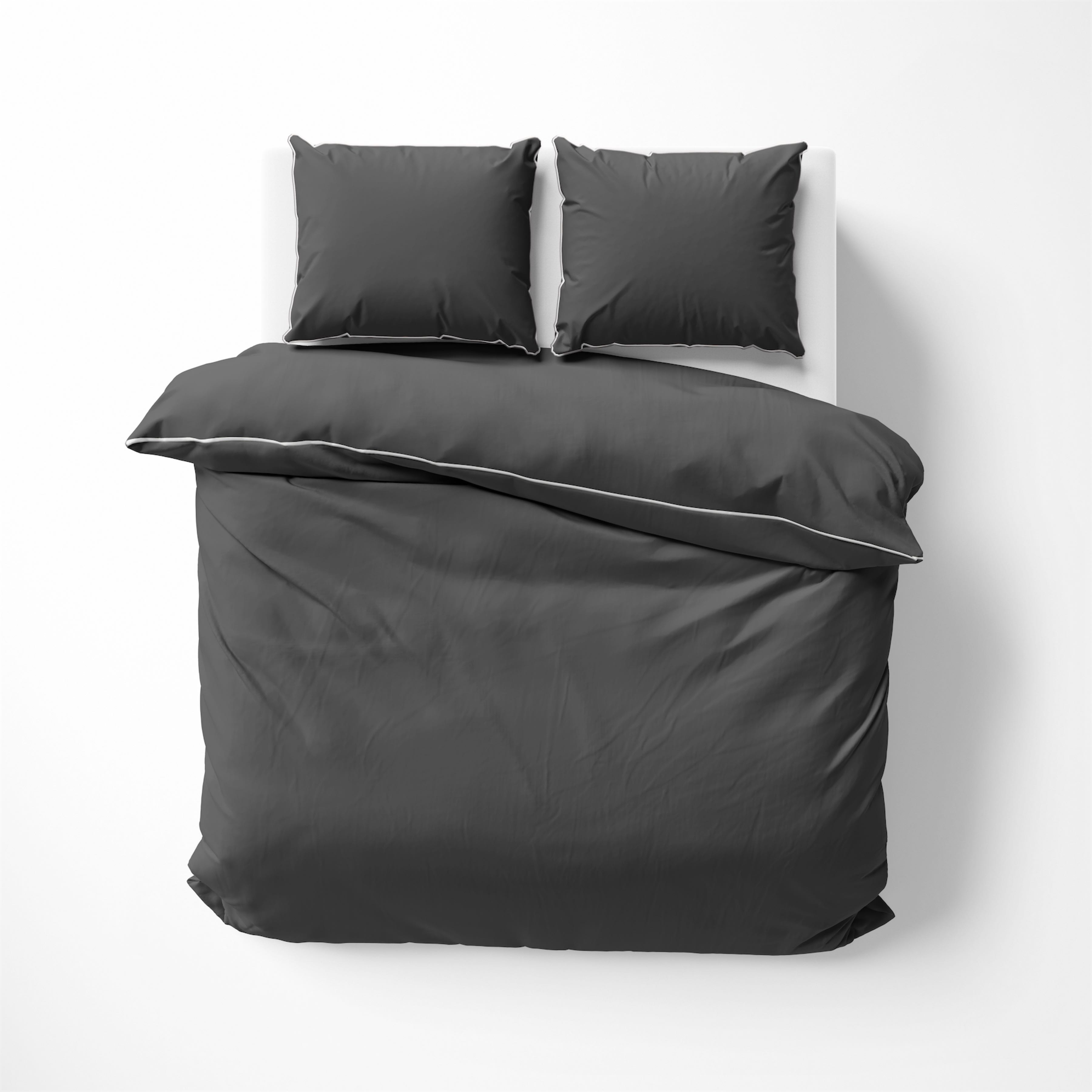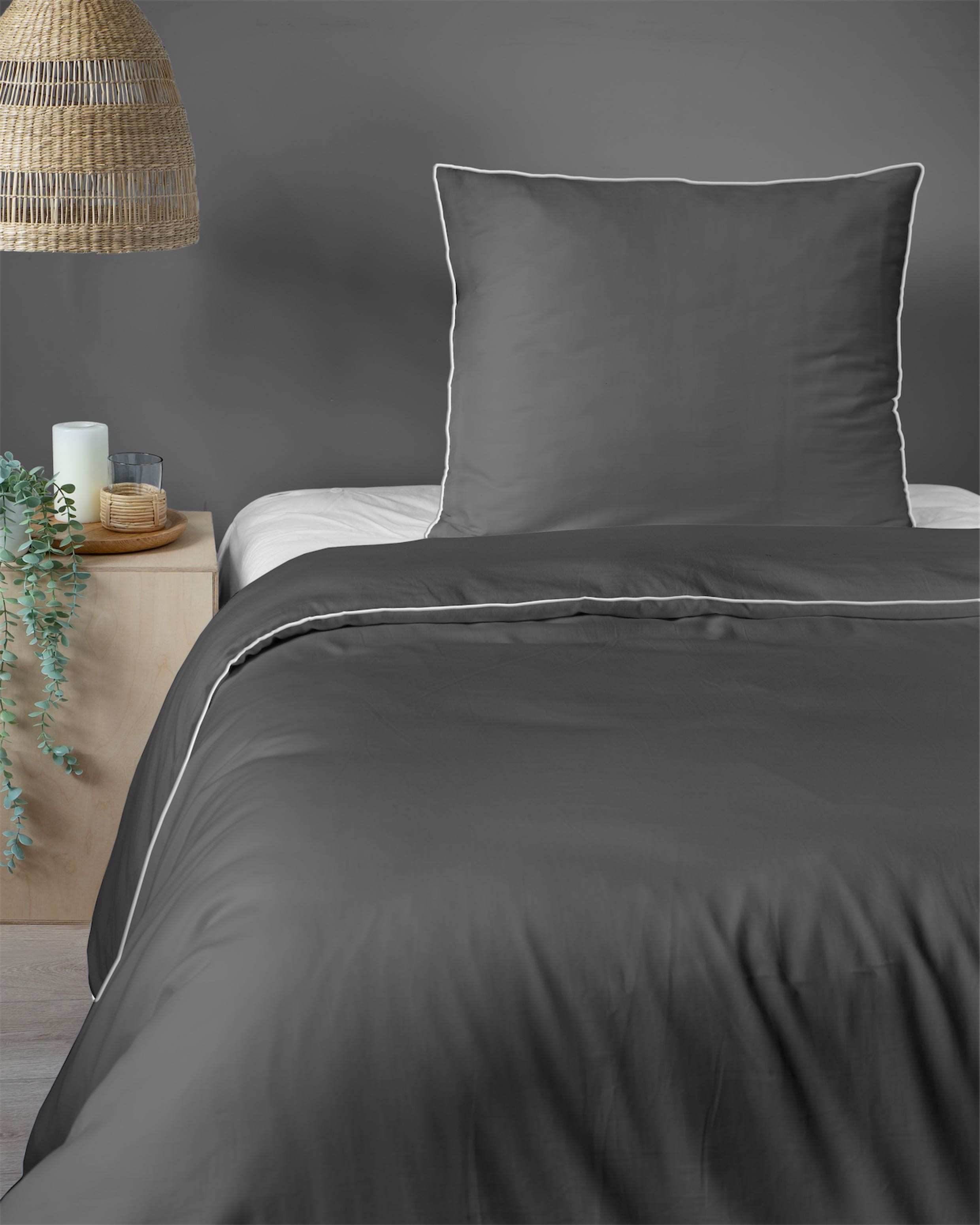 Głęboki, ciemnoszary odcień z kontrastującą białą lamówką nadaje sypialni nowoczesny i wyrafinowany charakter,