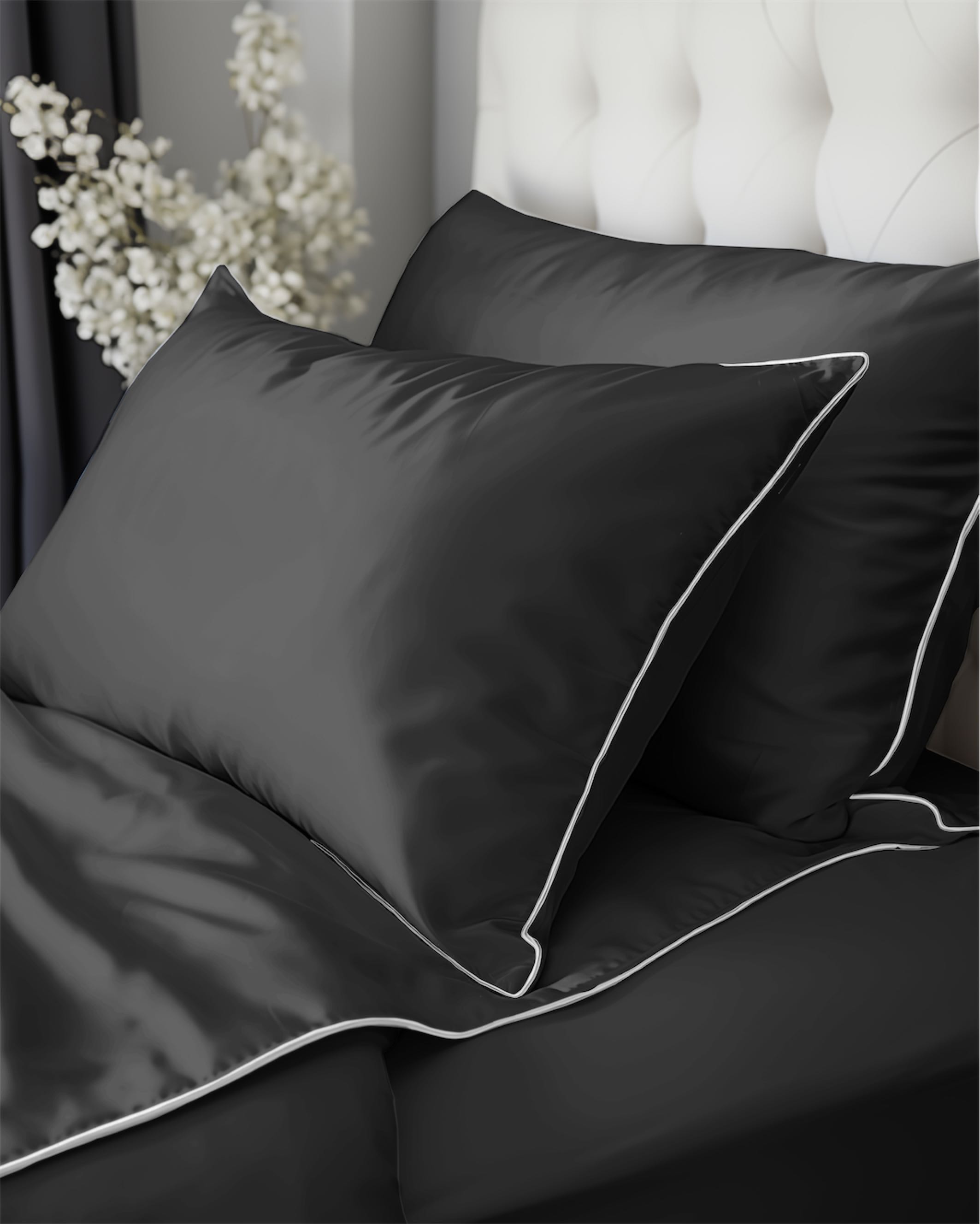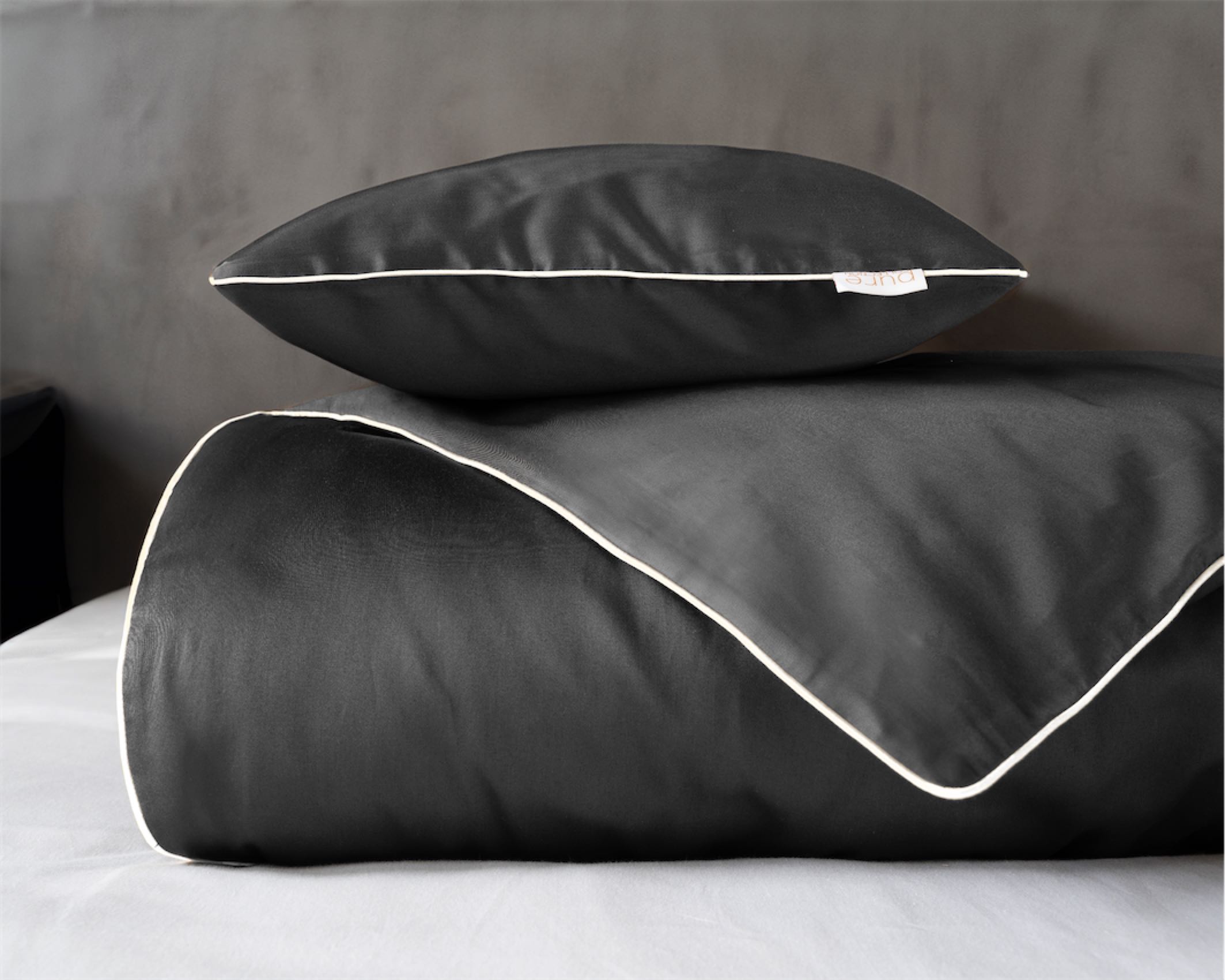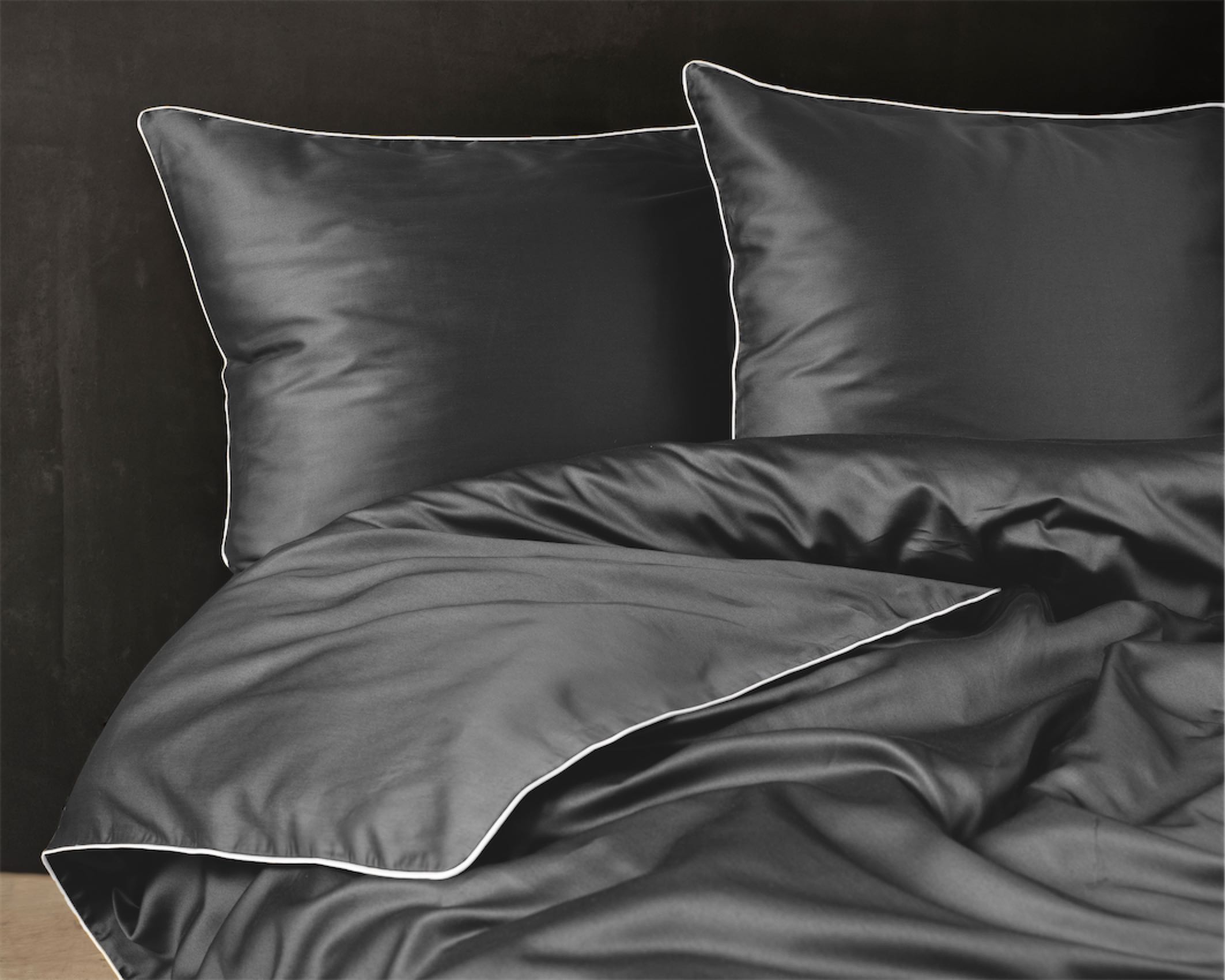 Głęboki, ciemnoszary odcień z kontrastującą białą lamówką nadaje sypialni nowoczesny i wyrafinowany charakter,