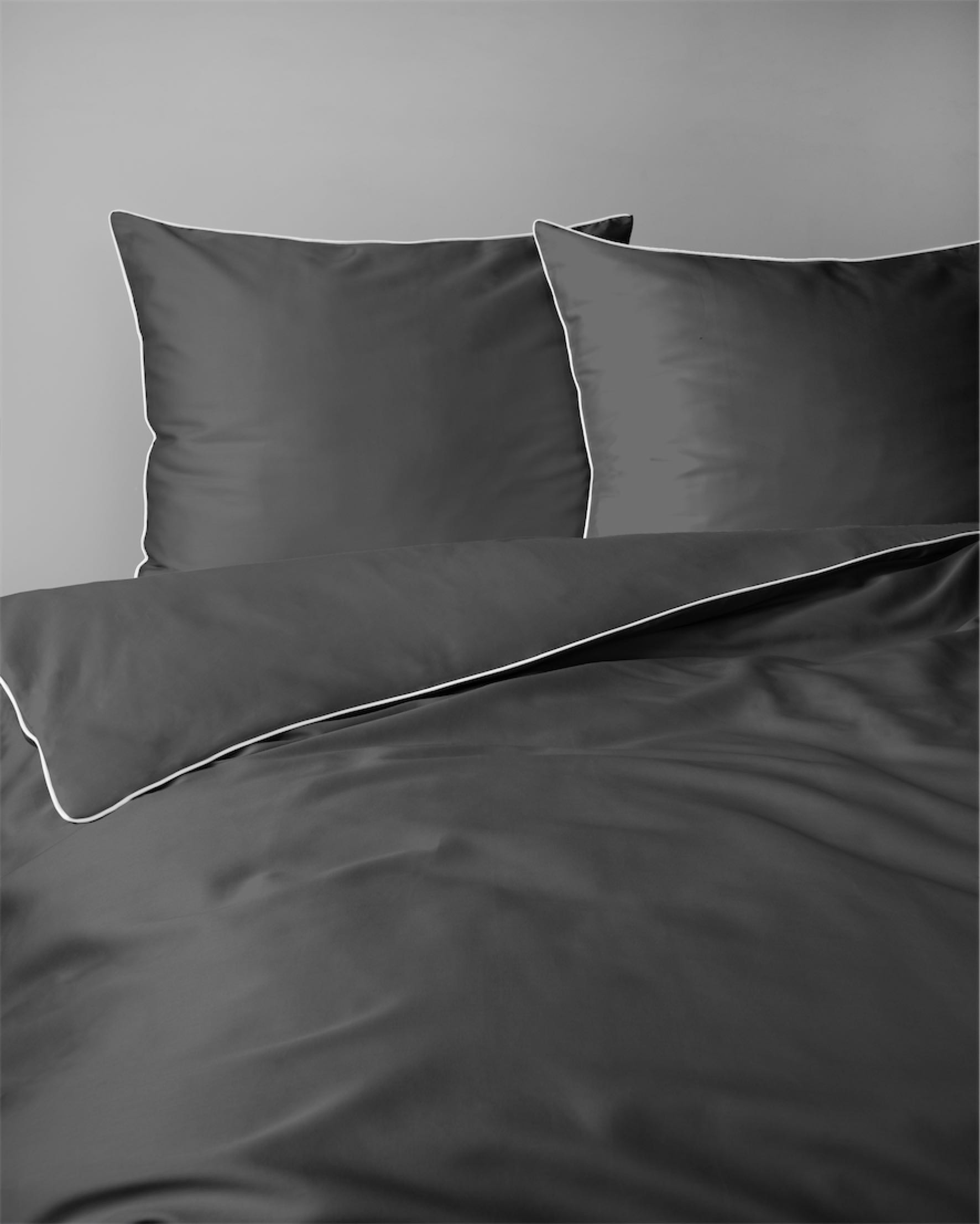 Głęboki, ciemnoszary odcień z kontrastującą białą lamówką nadaje sypialni nowoczesny i wyrafinowany charakter,