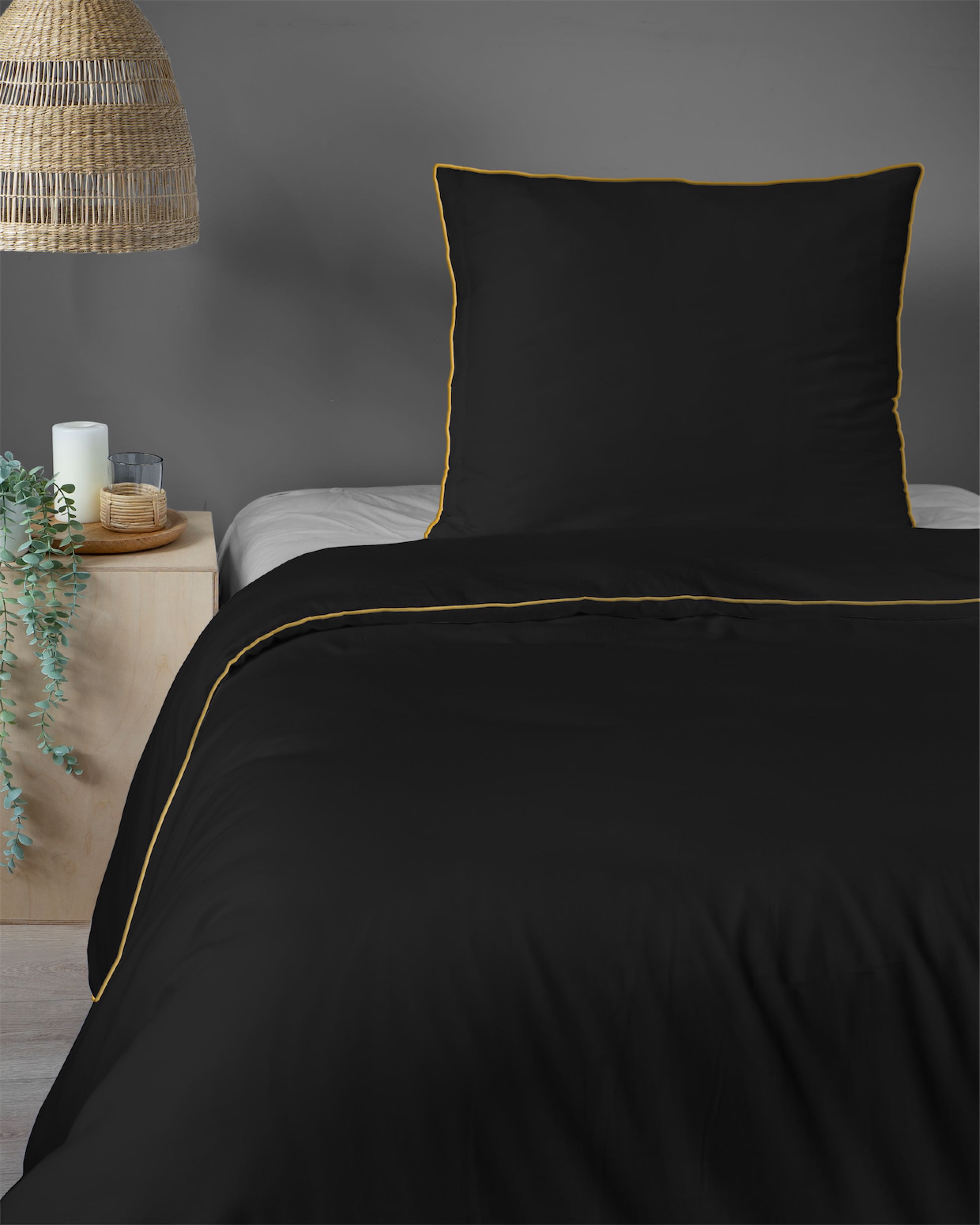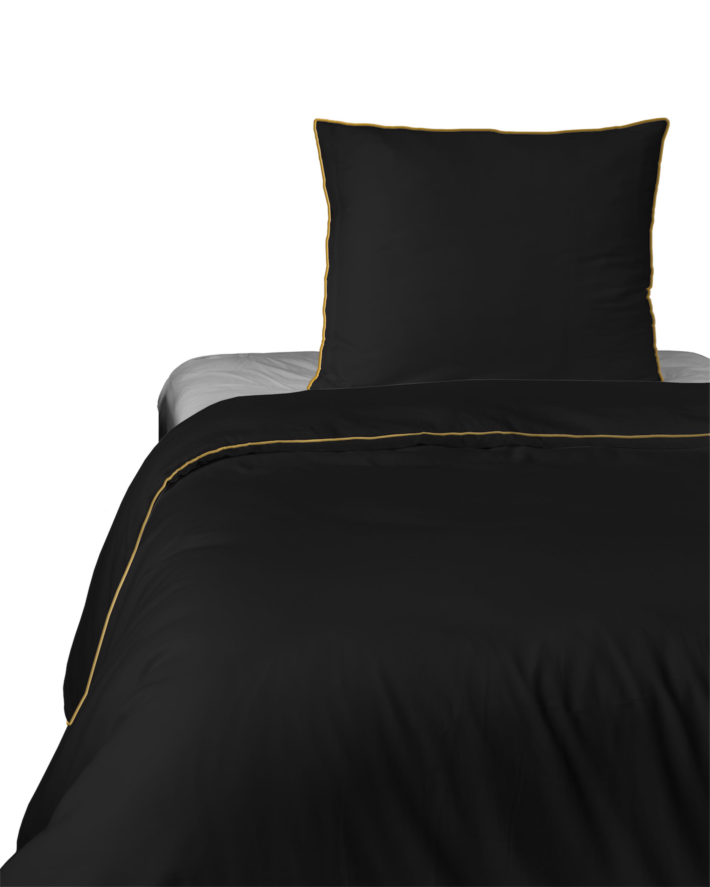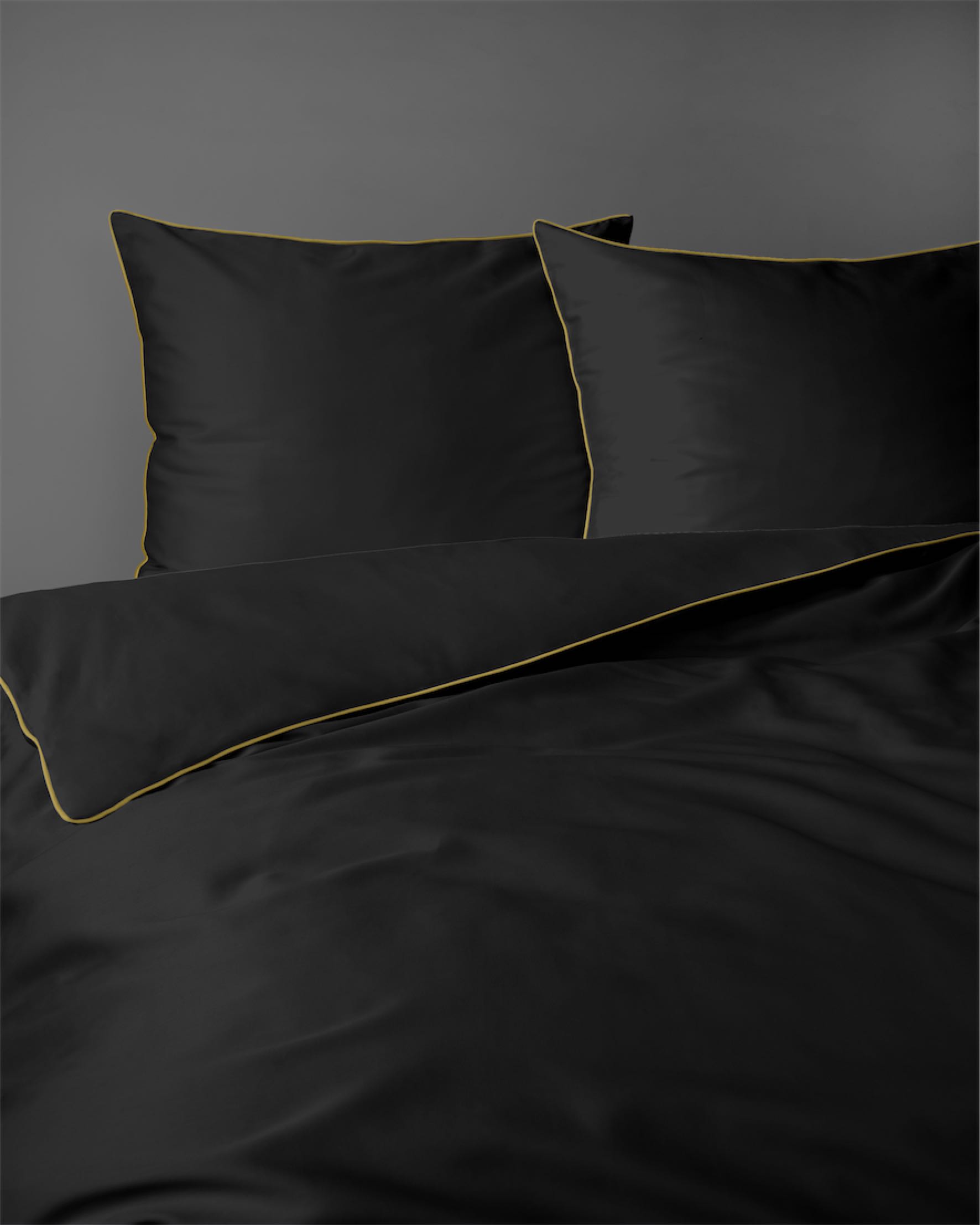 Klasyczna czerń z wyrazistą, złotą lamówką dodaje sypialni szyku i nowoczesnego charakteru,