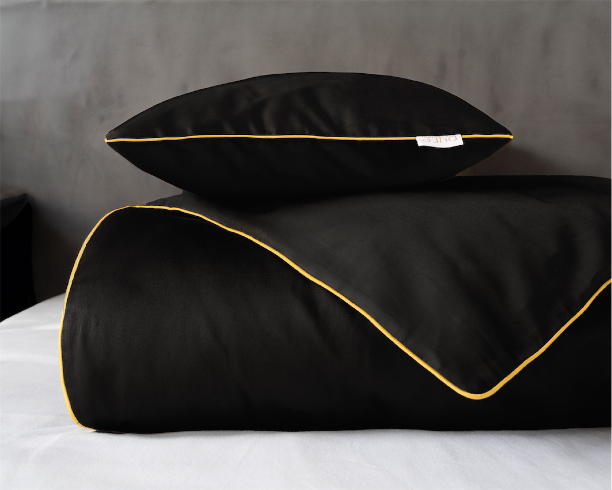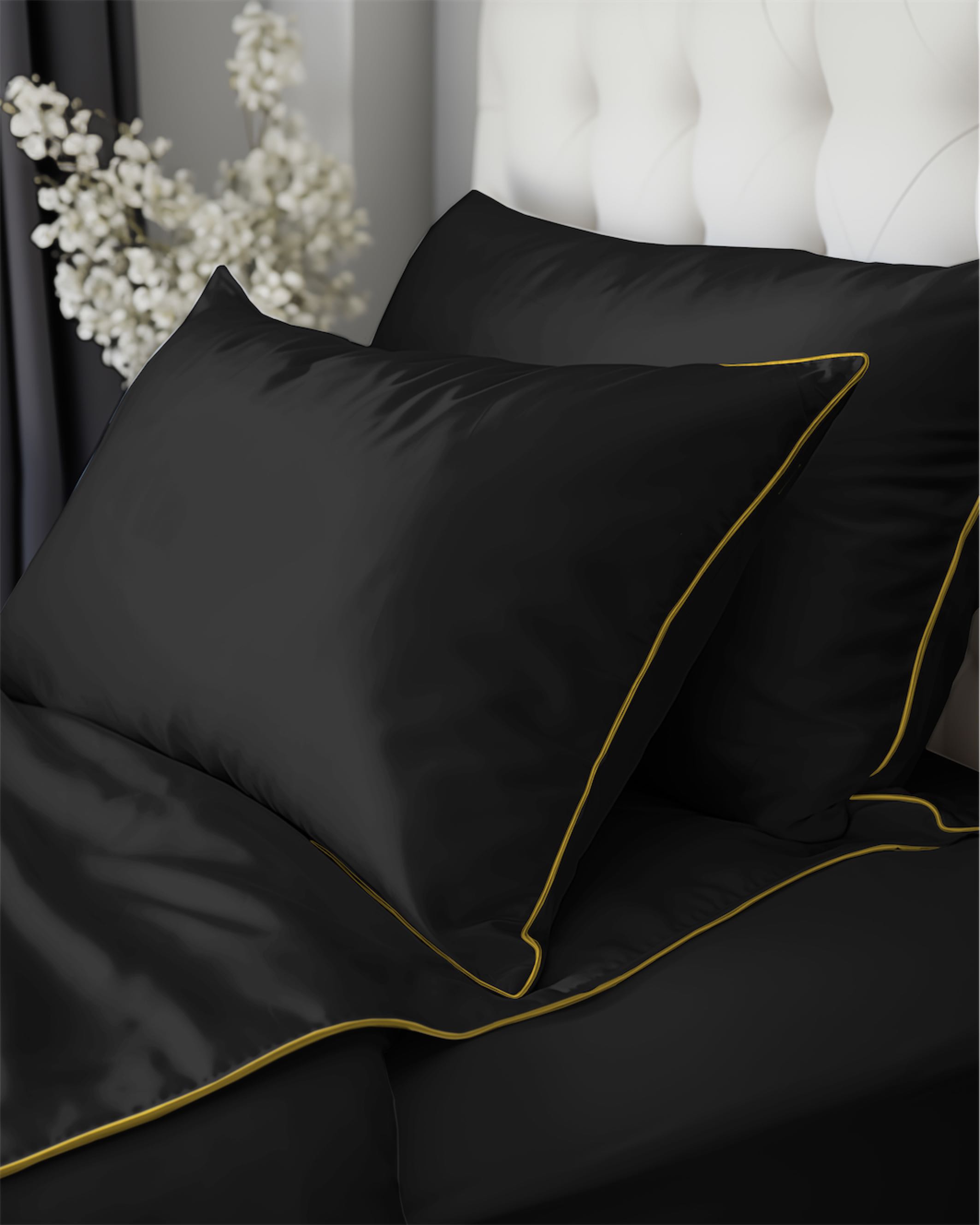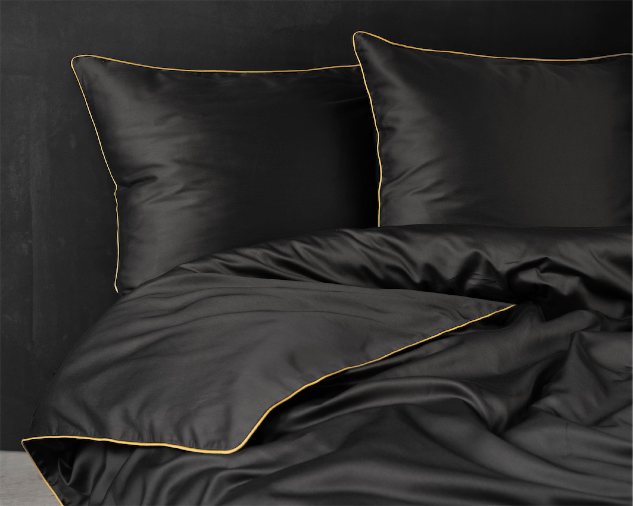 Klasyczna czerń z wyrazistą, złotą lamówką dodaje sypialni szyku i nowoczesnego charakteru,