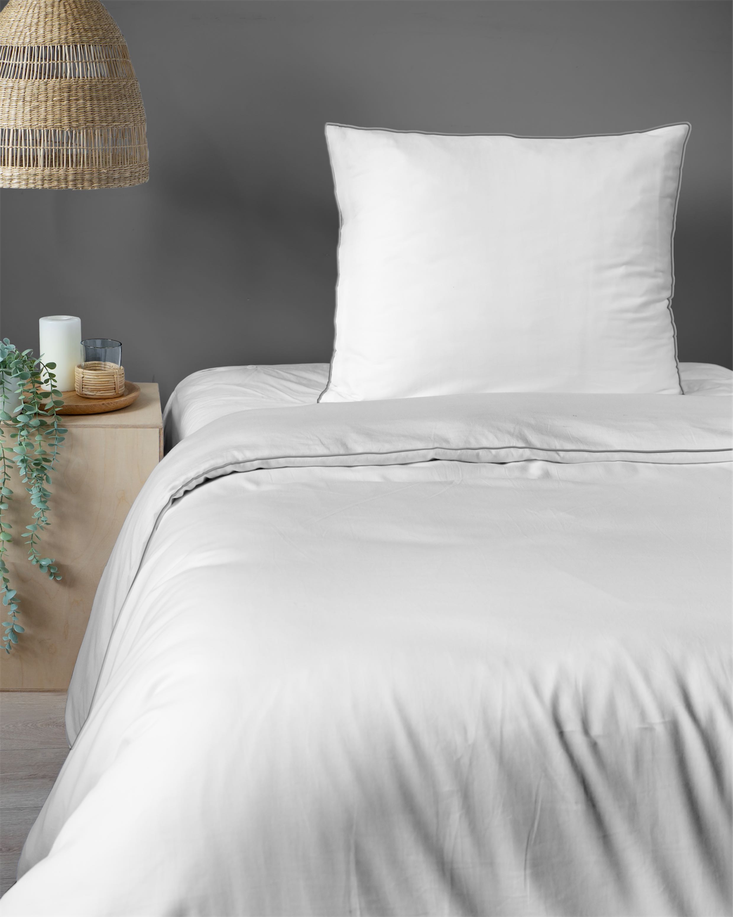 Śnieżnobiały odcień z subtelną lamówką wprowadza do sypialni świeżość i ponadczasową elegancję,