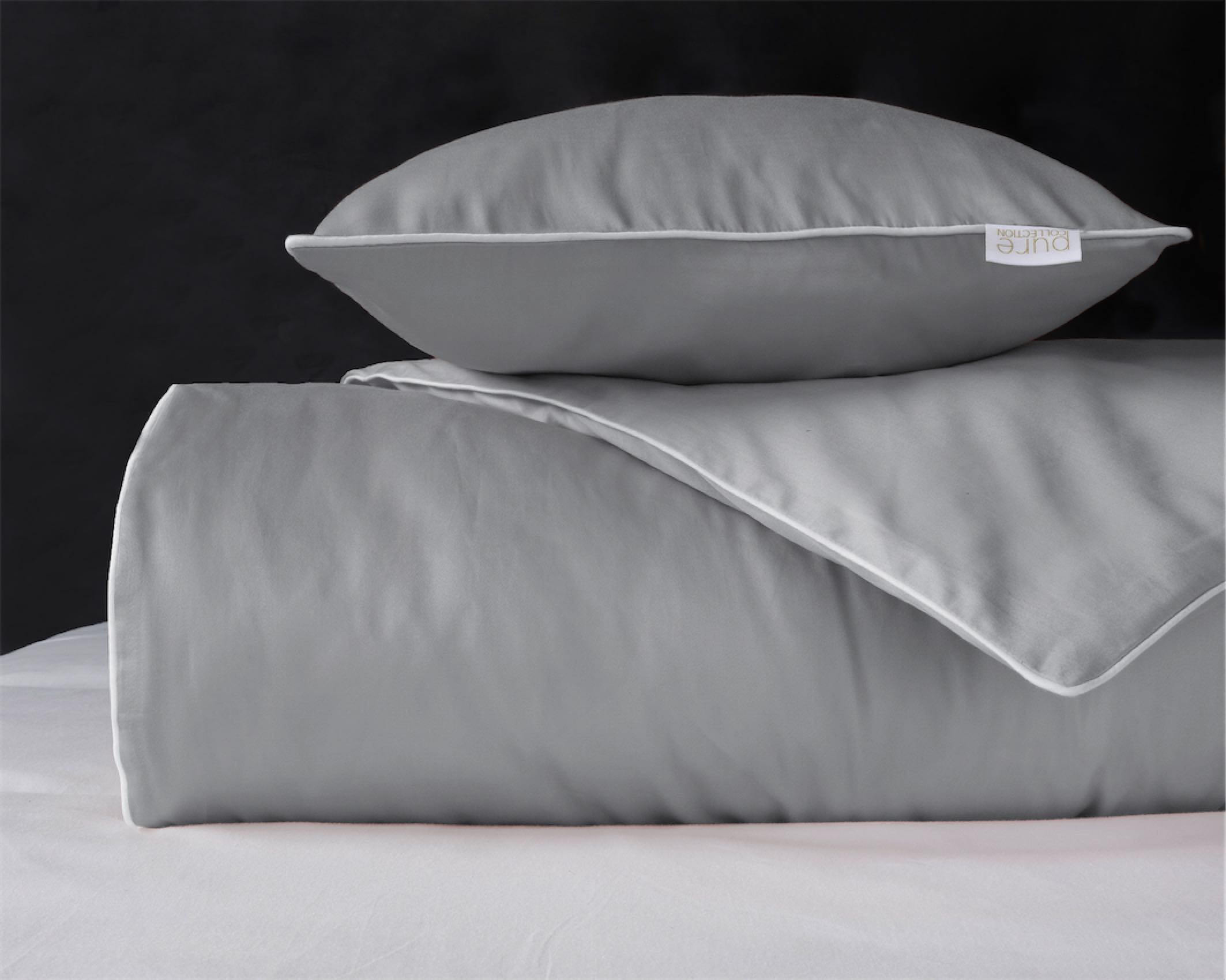 Jasnoszary odcień z białą lamówką dodaje sypialni lekkości i harmonii,