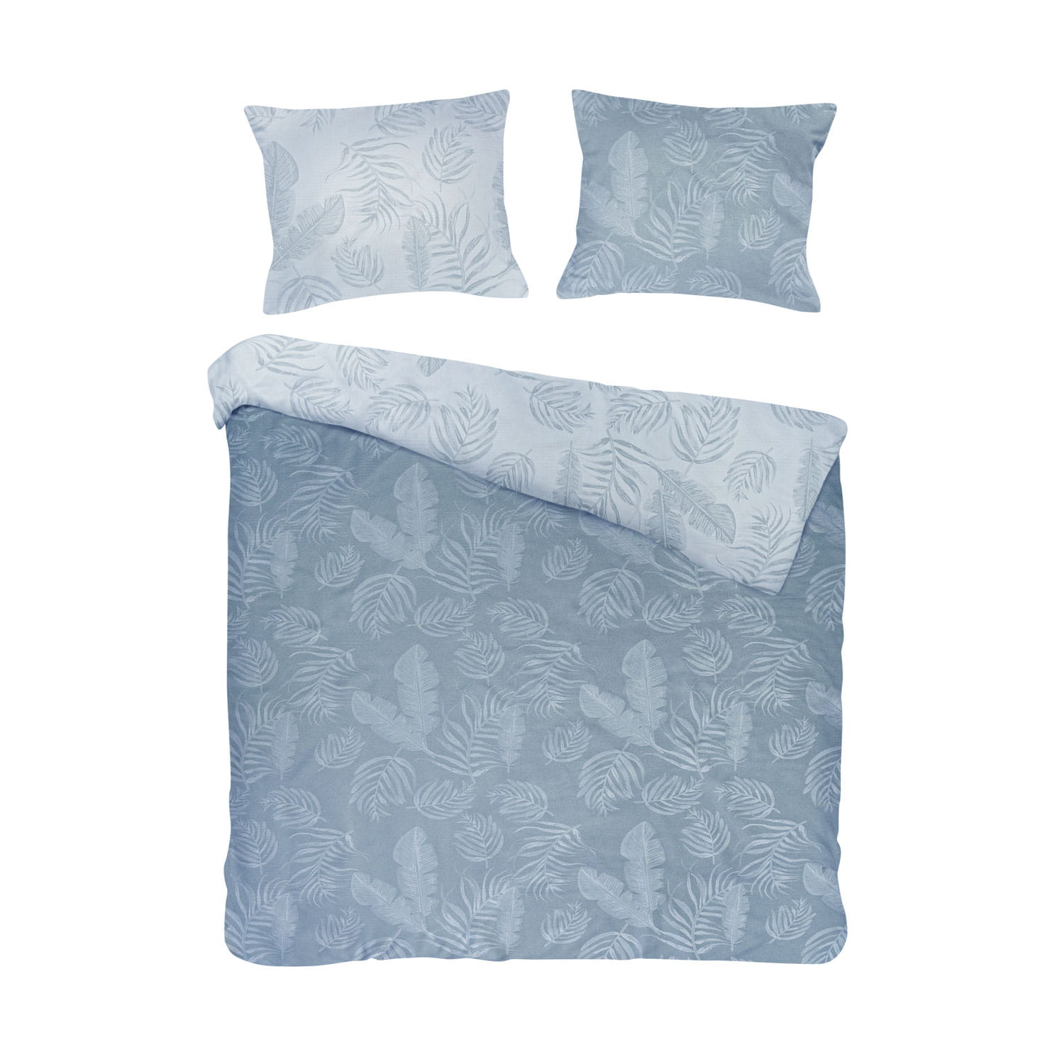 urzeka chłodnym odcieniem błękitu i liściastym żakardowym wzorem.