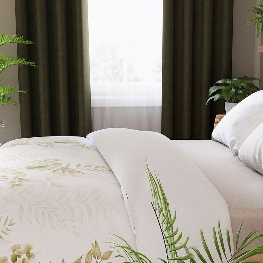 Subtelne, harmonijne wzory inspirowane naturą wprowadzają do sypialni atmosferę spokoju i relaksu.