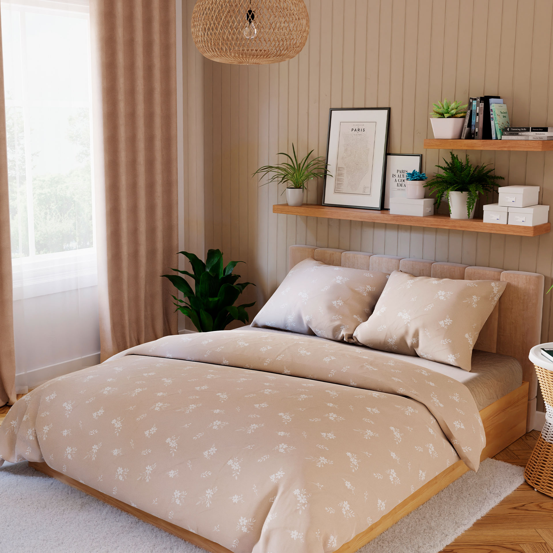 Subtelne, harmonijne wzory inspirowane naturą wprowadzają do sypialni atmosferę spokoju i relaksu.